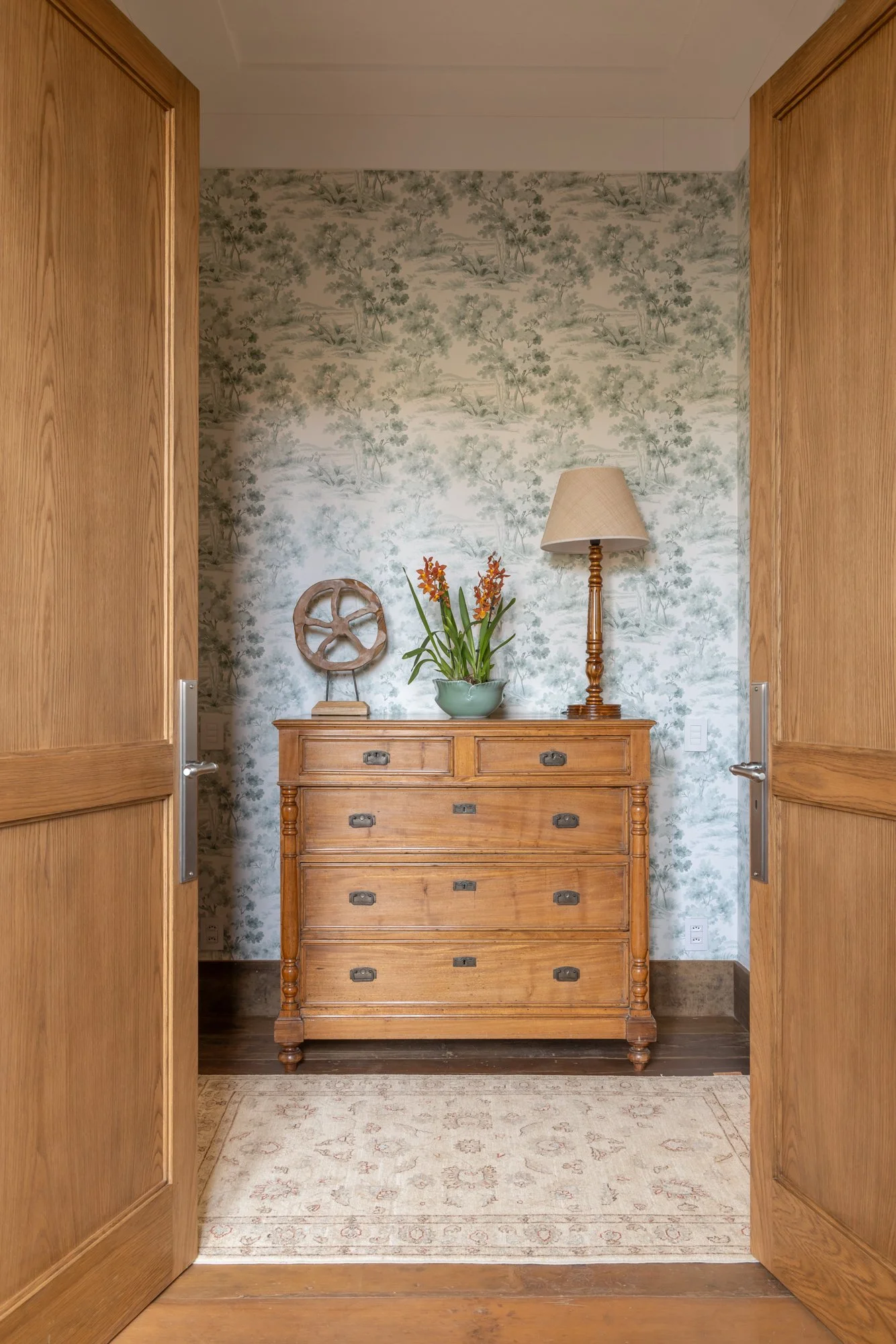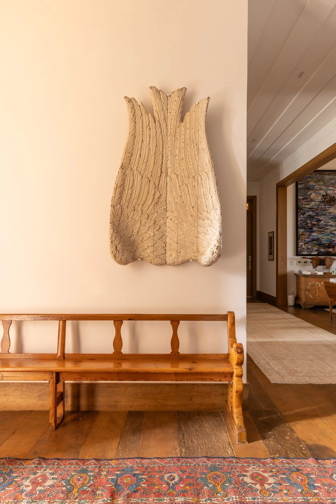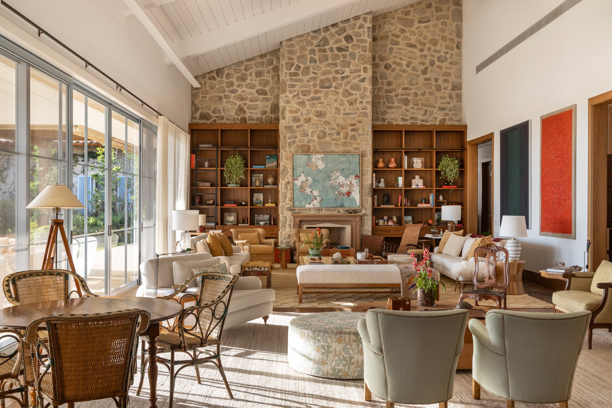 Desenhos antigos foram revisitados e uma pesquisa extensa foi realizada para a concepção das marcenarias e frontões de lareira. Antiguidades garimpadas completam a composição — todos os elementos que transformaram os ambientes em uma verdadeira experiência.